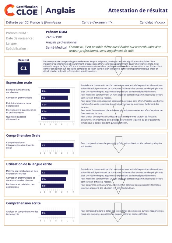 - la certification Compétences Linguistiques Orales et Ecrites (CLOE) est reconnue, elle est délivrée par la Chambre de Commerce et d’Industrie française en tant qu’organisme certificateur : CCI FRANCE